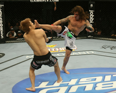 | Clay Guida kept landing head kicks to Takanori Gomi |